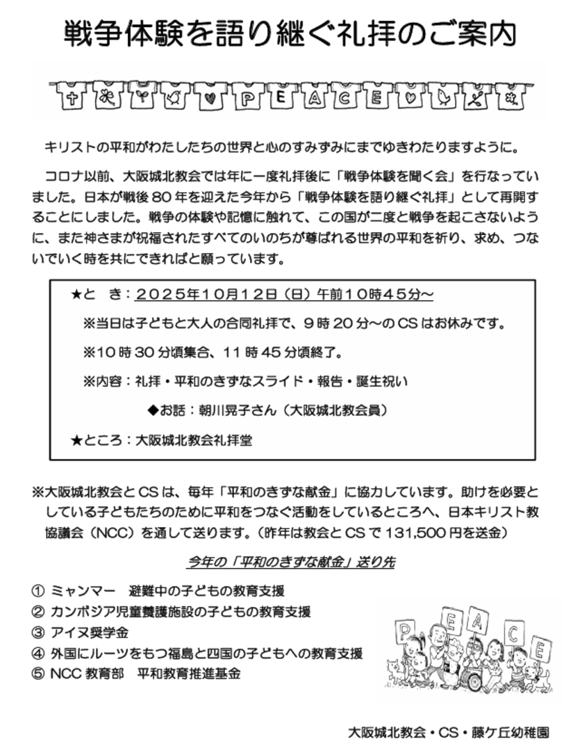 当教会ではコロナ禍前まで行っていた戦争体験を聞く会を「戦争体験を語り継ぐ会」として再開することになりました。教会員以外の方も多くの方の参加をお待ちしております。