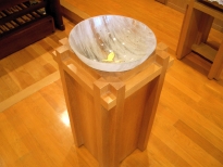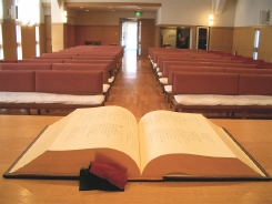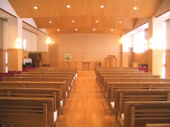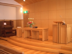 礼拝は2階の礼拝堂で行なっています。2階の入口にある受付で、はじめて来た旨お伝えいただければ、その日に用いる聖書、讃美歌、交読詩編、プログラムなどをお渡しします。そのまま礼拝堂にお入りください。席は自由ですので、お好きな場所へお座りください。